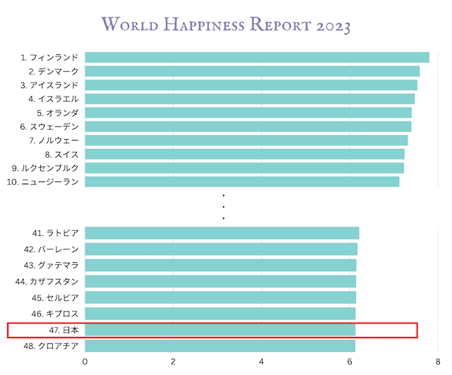 日本は世界第3位の経済大国であると言いますが、2023年3月に発表された国連の世界幸福度レポート(https://worldhappiness.report/ed/2023/)のランキングでは47位。前年の54位より上がっているものの、主要7カ国(G7)では最下位のままです。